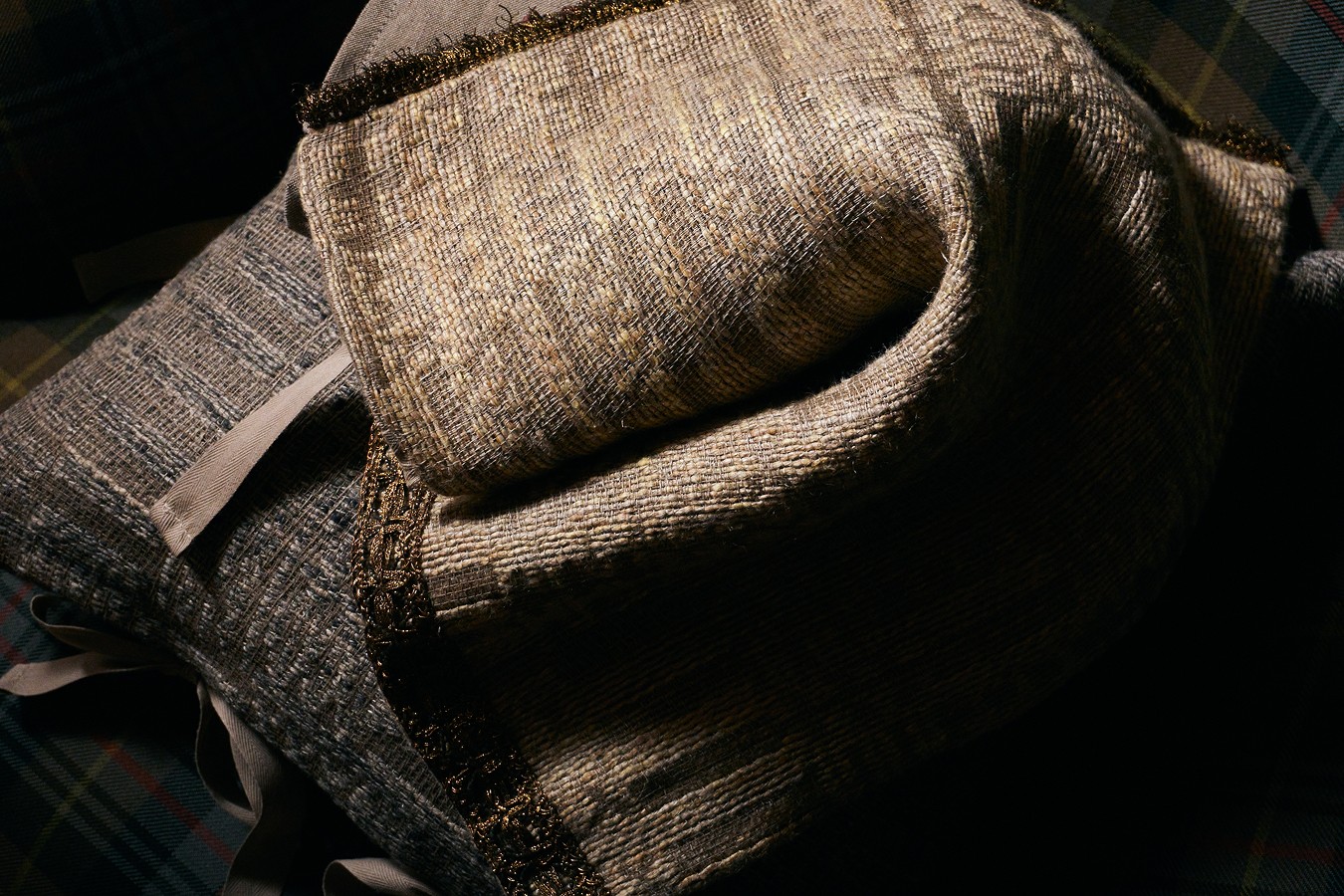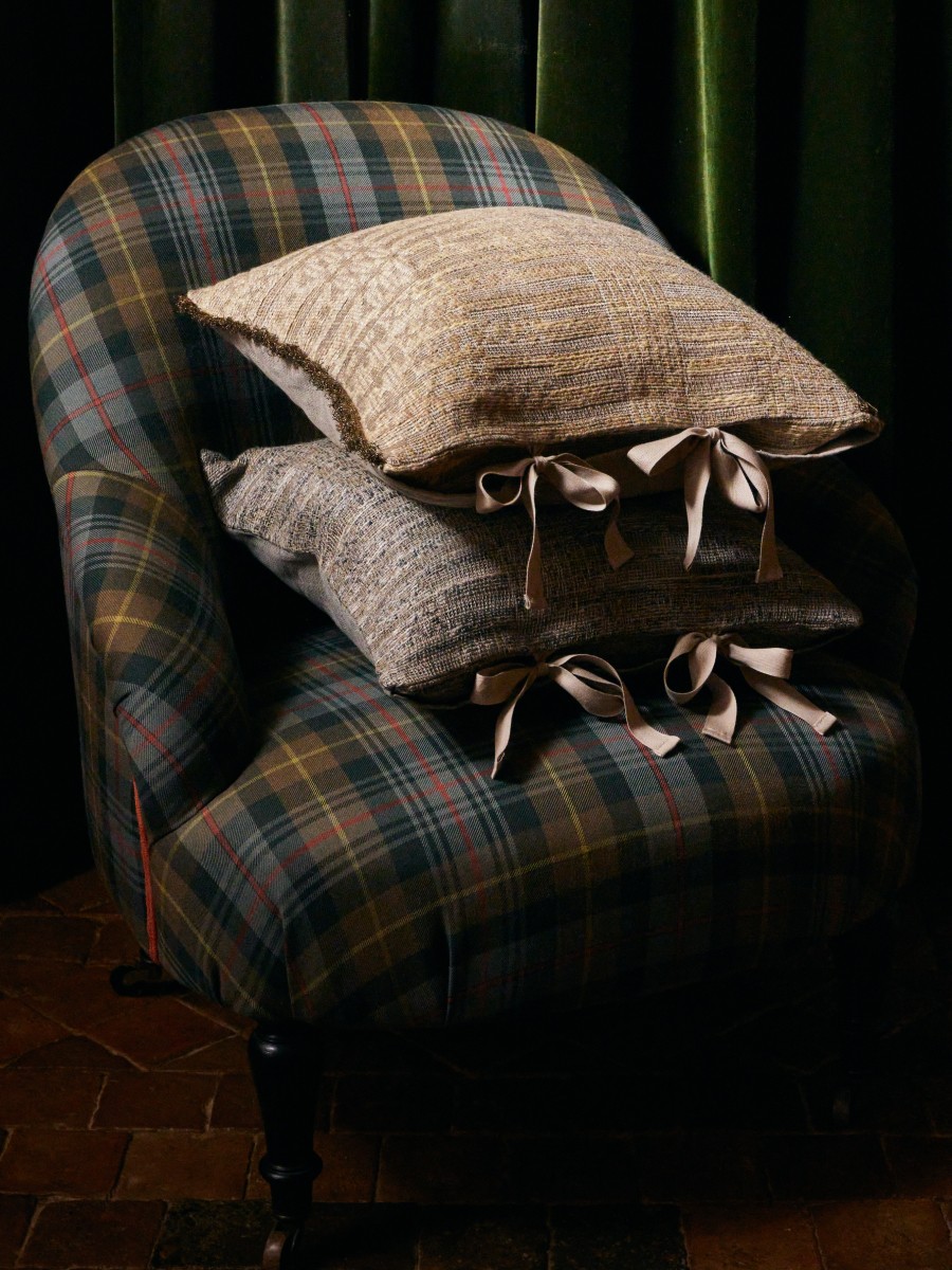 Cushions in pre-washed linen jacquard check, one trimmed in 19c French gold metallic passementeries (40cm2)