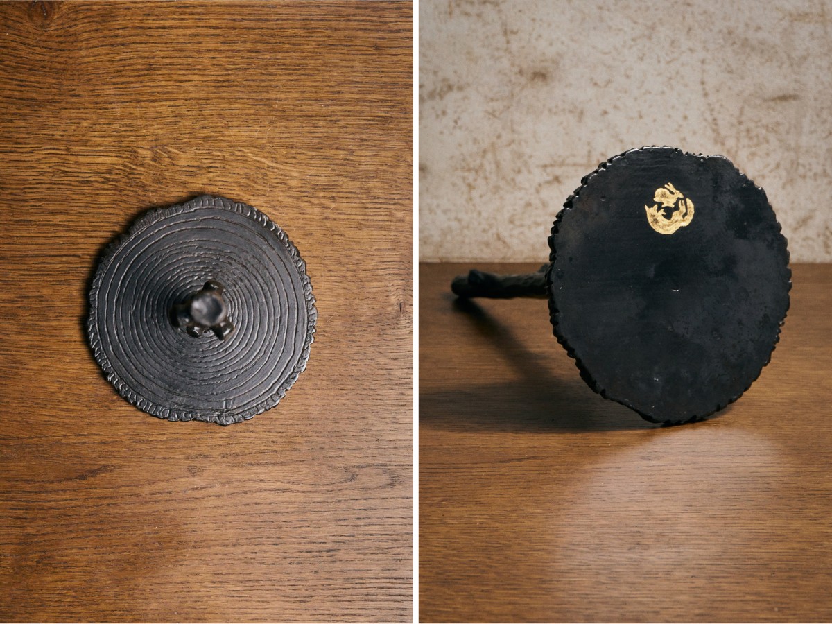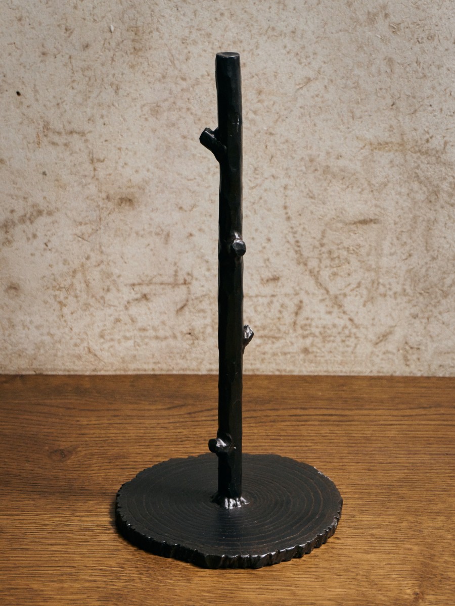 "Chene" Kitchen Roll Stand in hand-hammered & forge-blackened iron signed in 24-karat gold leaf (16 cm x 30 cm base x 1 cm)